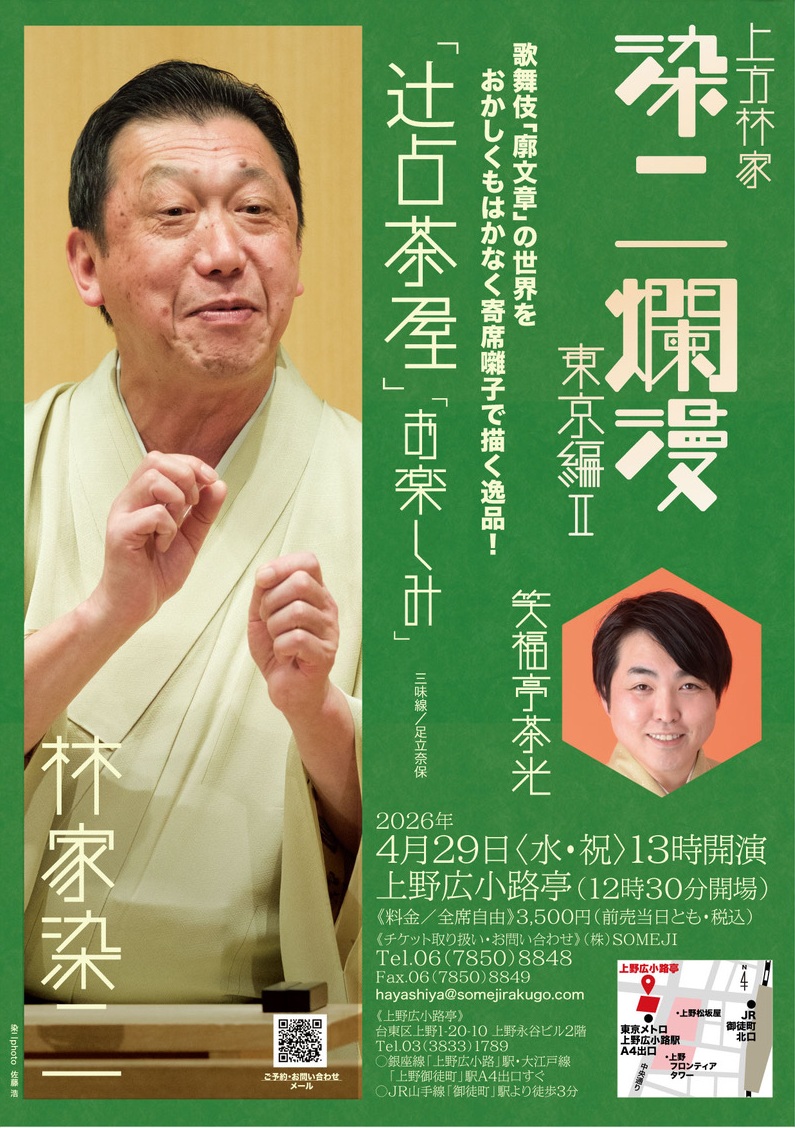 2026年新春の「染二爛漫」は、林家お家芸を二席。ゲストに曲独楽の伏見紫水師匠と桂福丸さんをお迎えします。お待ち致しております。