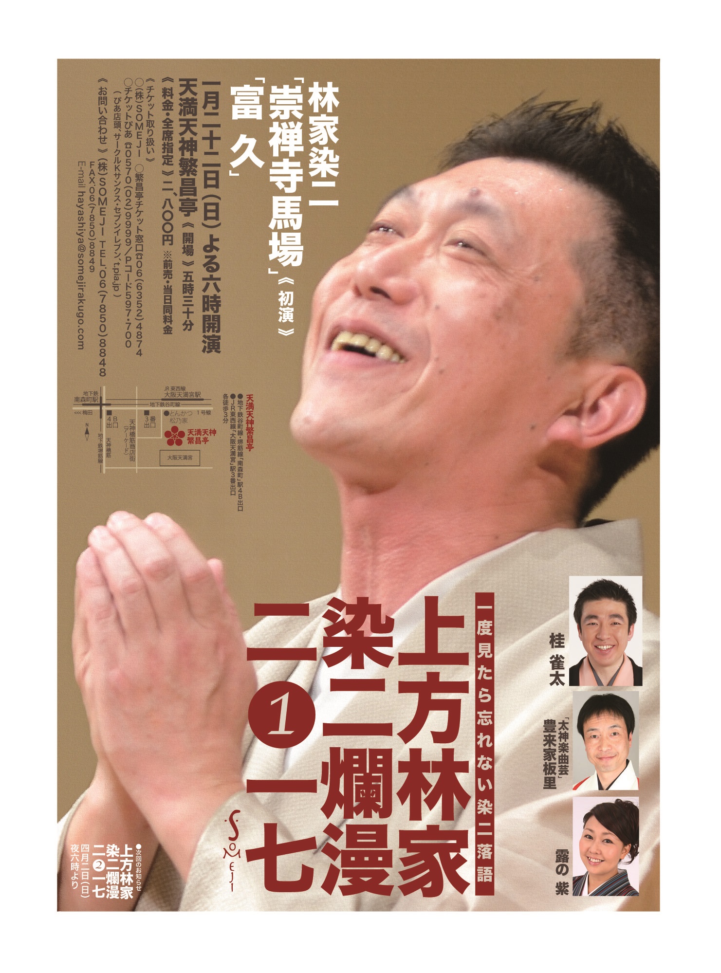 染二自身が主催する天満天神繁昌亭での公演は、11年目に突入します。タイトルは昨年に引き続き「上方林家 染二爛漫」。2ヶ月に1回のペースで開催します。